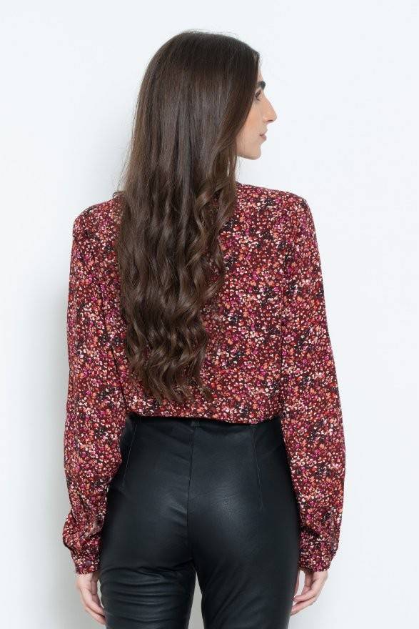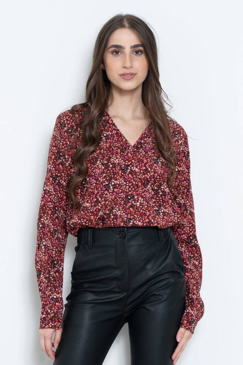 Γυναικεία υφασμάτινη μπλούζα σε μπορντό χρώμα με ανθάκια σε μαύρο, κόκκινους & ροζ τόνους. Σταθερό ύφασμα χωρίς ελαστικότητα.
