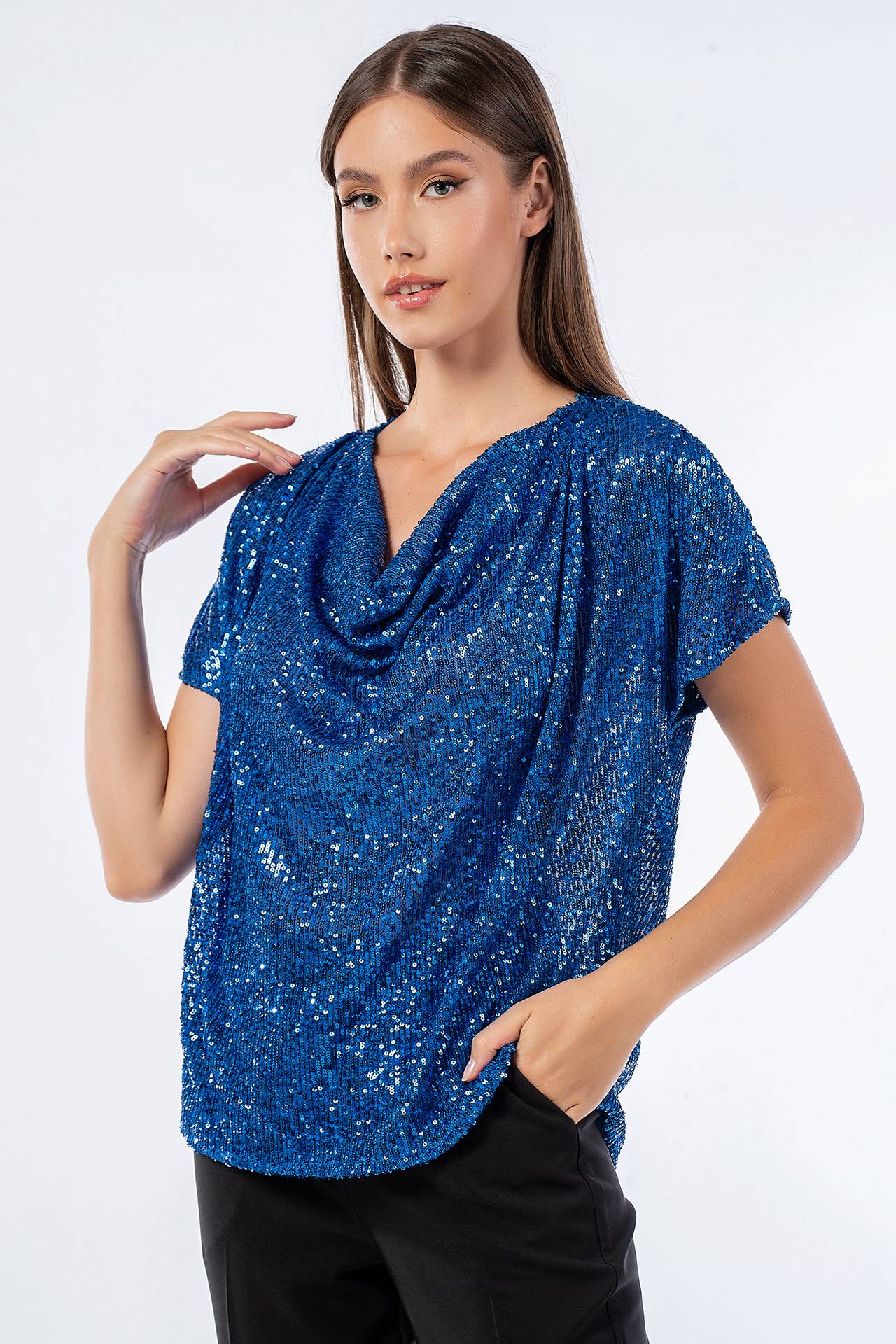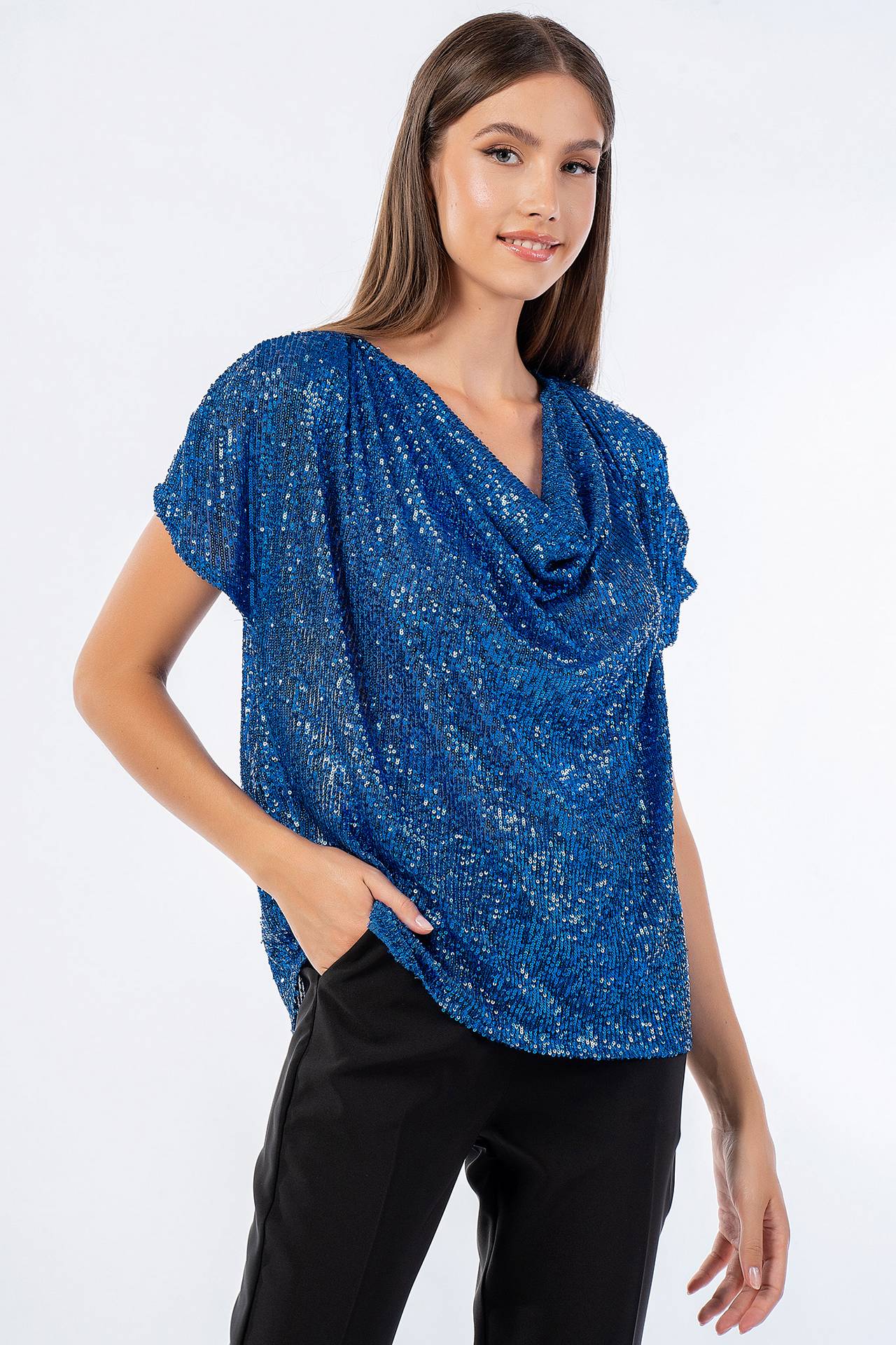 Παγιετένια μπλούζα κοντομάνικη σε άνετη γραμμή με ντραπέ λαιμόκοψη.
