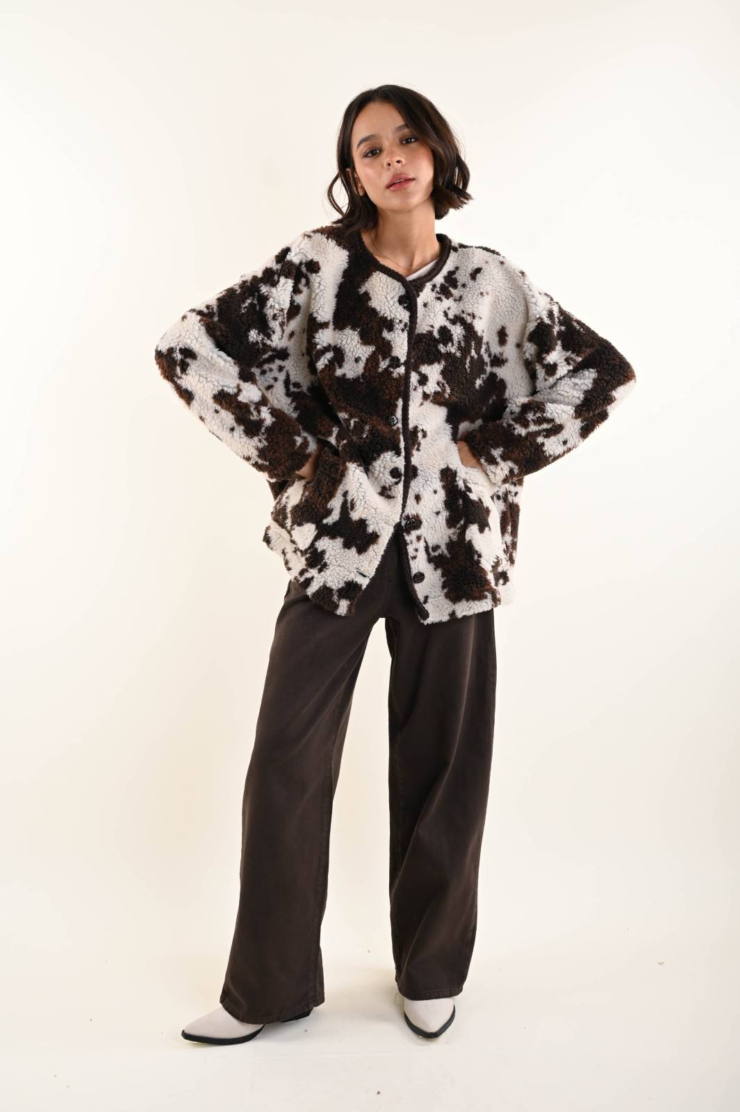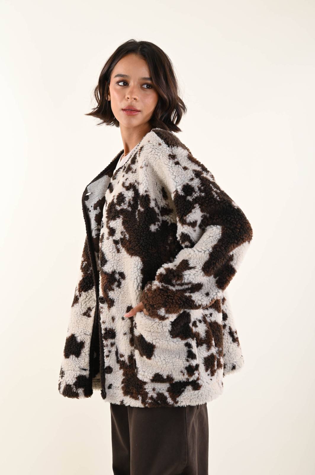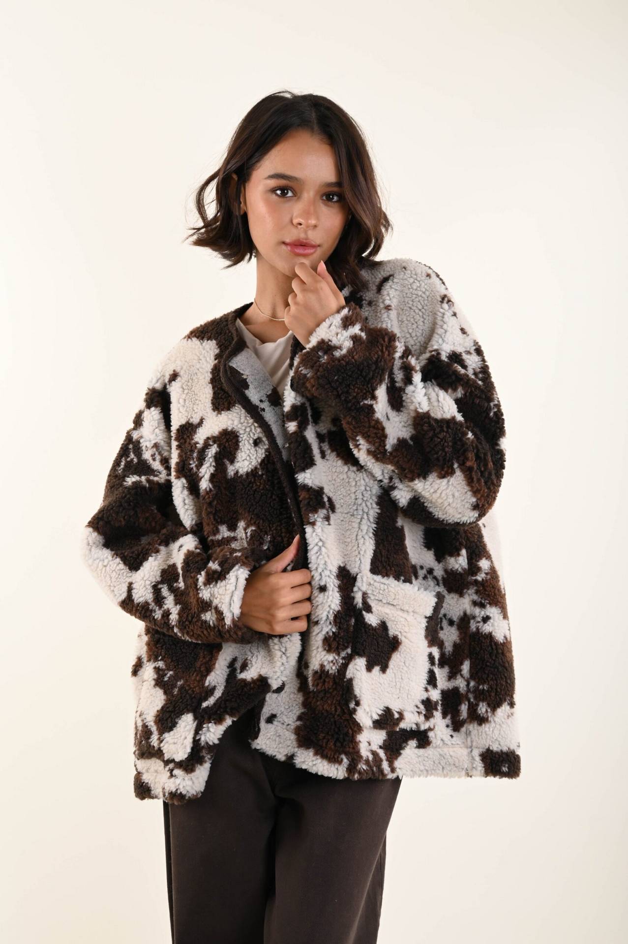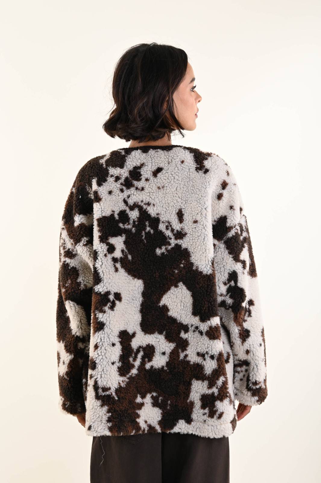 Oversized πανωφόρι από μαλακό fluffy ύφασμα και cow print τύπωμα.