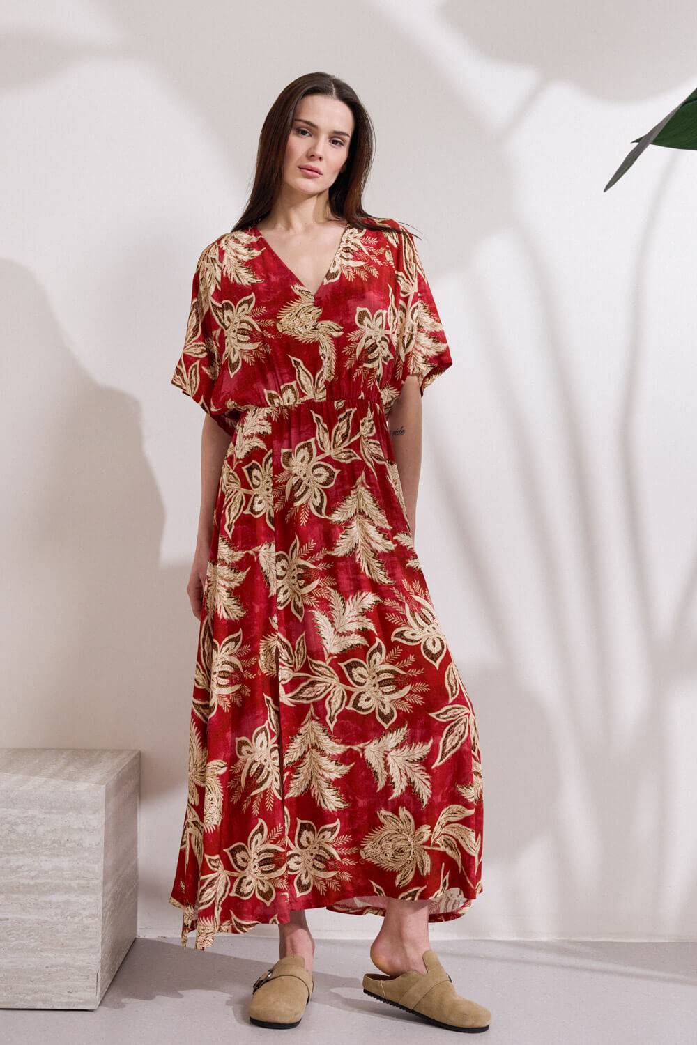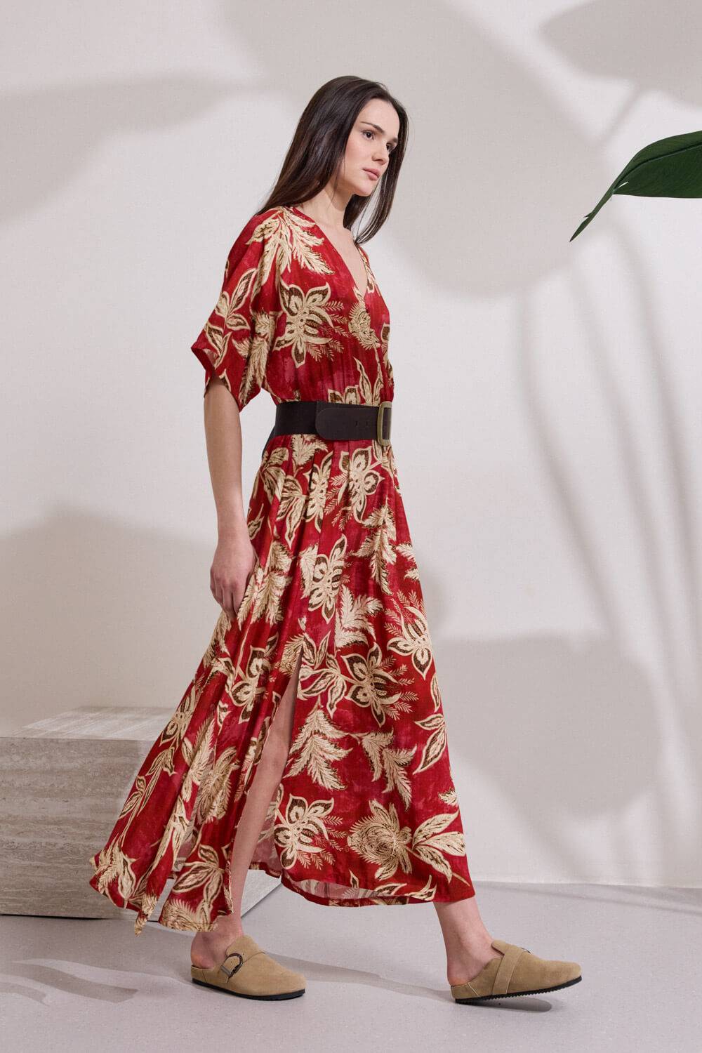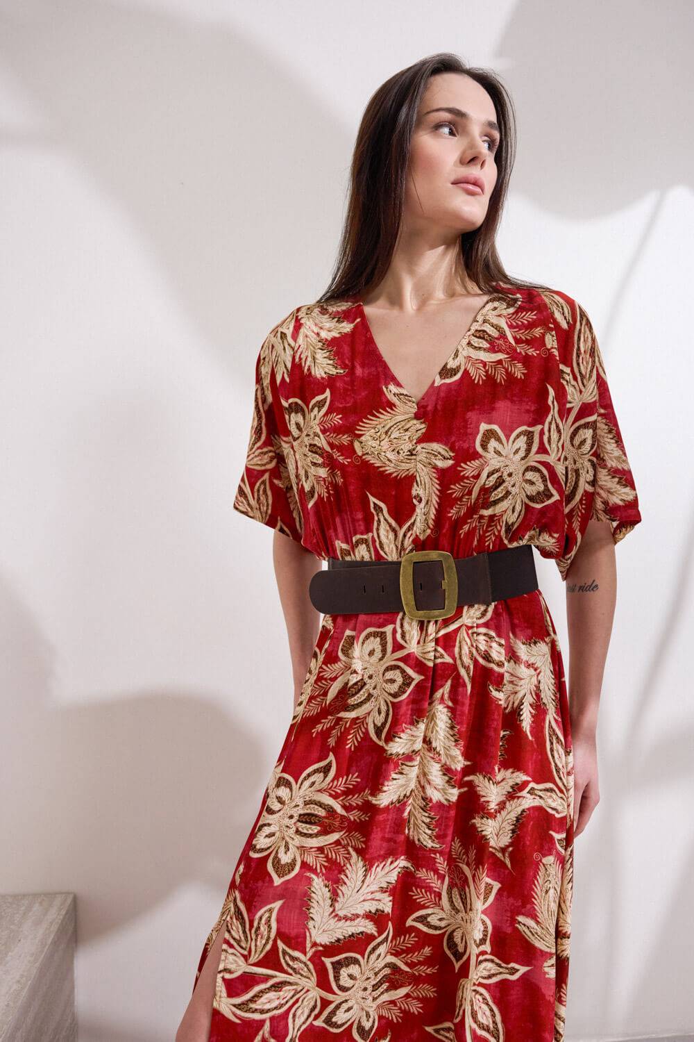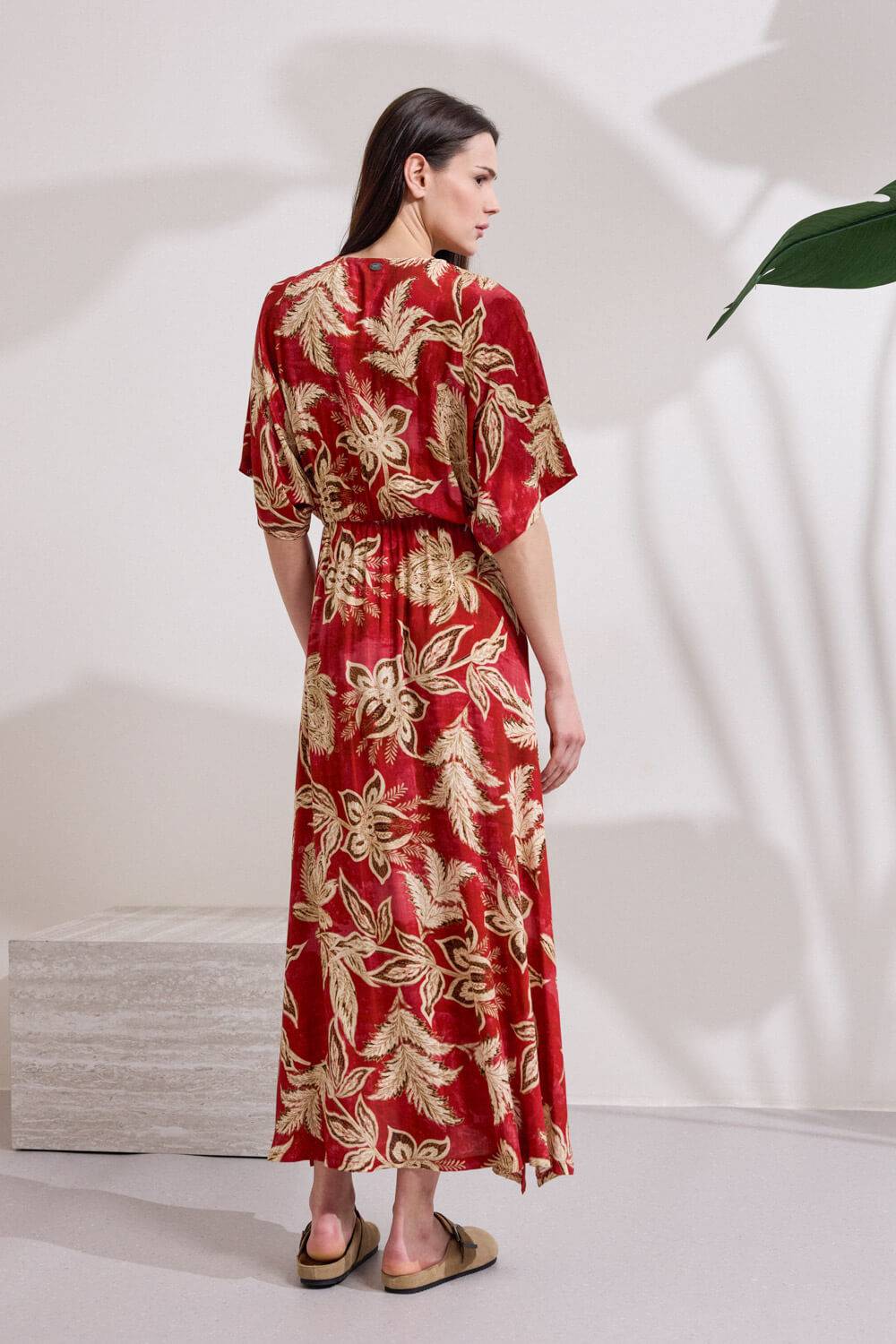 Φόρεμα μακρύ από viscose με έντονο print, σε ανάλαφρη γραμμή. Διαθέτει ζαπονέ μανίκια και V λαιμόκοψη με σειρά από διακοσμητικά ντυτά κουμπιά στο επάνω μέρος. Η μέση τονίζεται με διακριτικό λάστιχο για καλύτερη εφαρμογή, ενώ το μπροστινό άνοιγμα προσφέρει άνεση και αναδεικνύει τη σιλουέτα. “Αυτό το προϊόν έχει φτιαχτεί με αγάπη και σεβασμό στο περιβάλλον χρησιμοποιώντας φυσικές ίνες.”