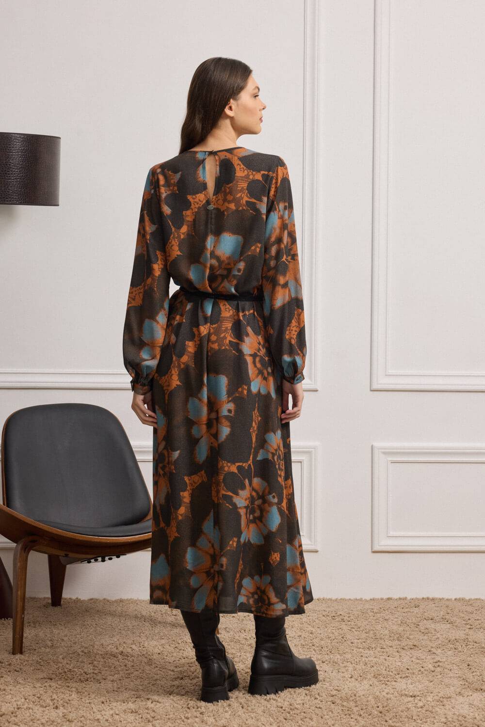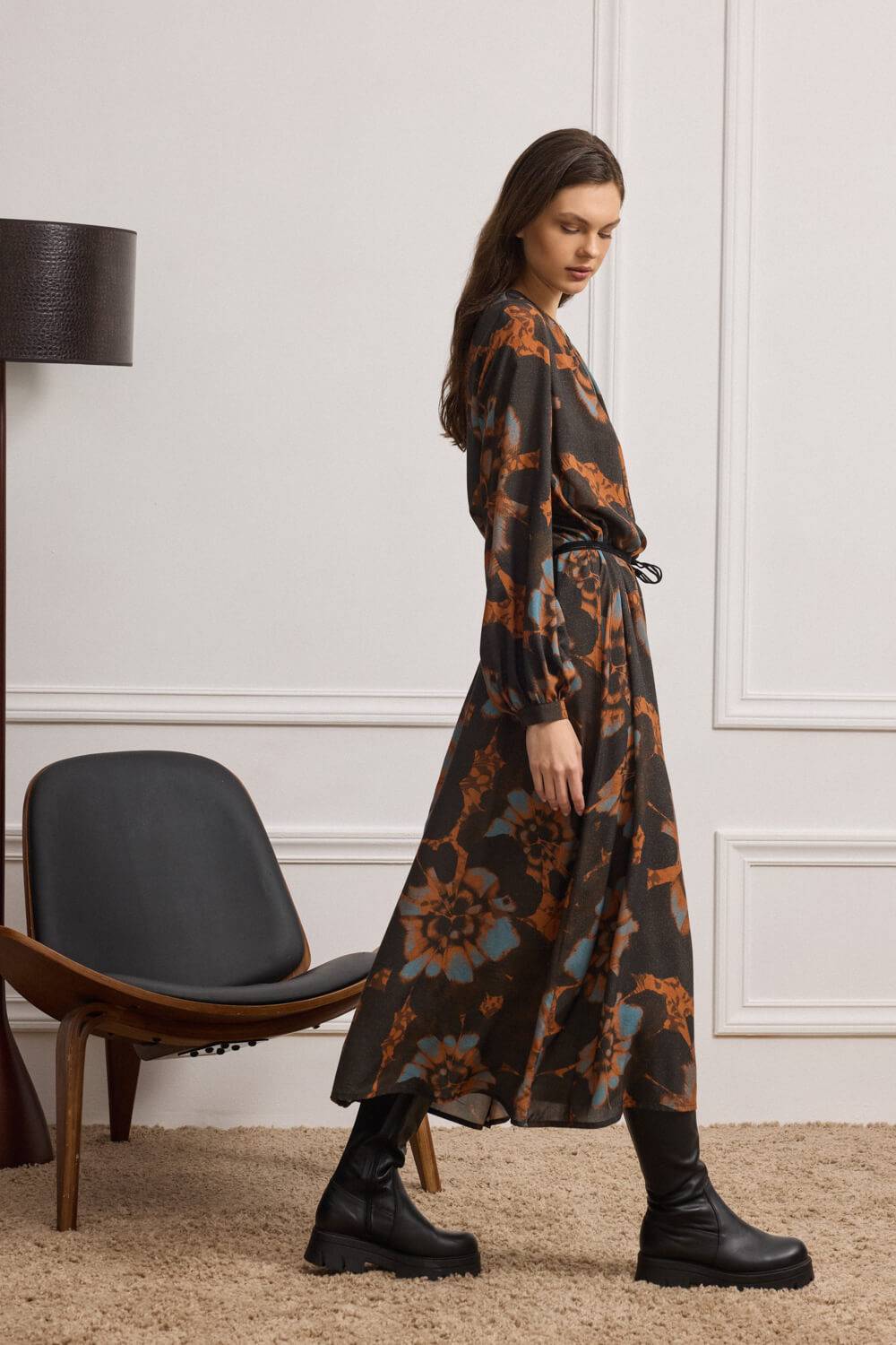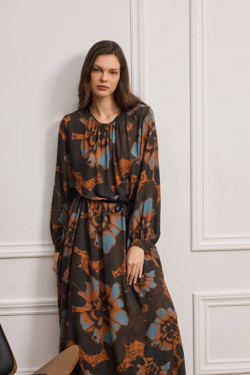 Maxi φόρεμα από ανάλαφρη βισκόζη με διακριτικό lurex στην ύφανση, και ιδιαίτερο print butterflied flowers, που χαρίζει ρομαντική, καλλιτεχνική αύρα. Η στρογγυλή λαιμόκοψη κλείνει πίσω στο λαιμό με μεταλλικό κουμπί και αφήνει ένα μικρό άνοιγμα για εκλεπτυσμένη λεπτομέρεια. Τα μακριά μανίκια καταλήγουν σε μανσέτες με μεταλλικά κουμπιά. Η άνετη, χυτή σιλουέτα συνοδεύεται από αποσπώμενο μαύρο ζωνάκι που δένει στη μέση, δίνοντας τη δυνατότητα για ελαφριά τονισμένη σιλουέτα ή πιο χαλαρό look. “Αυτό το προϊόν έχει φτιαχτεί με αγάπη και σεβασμό στο περιβάλλον χρησιμοποιώντας φυσικές ίνες.”