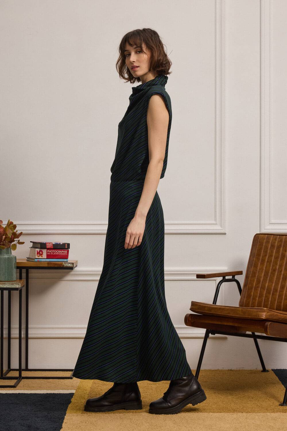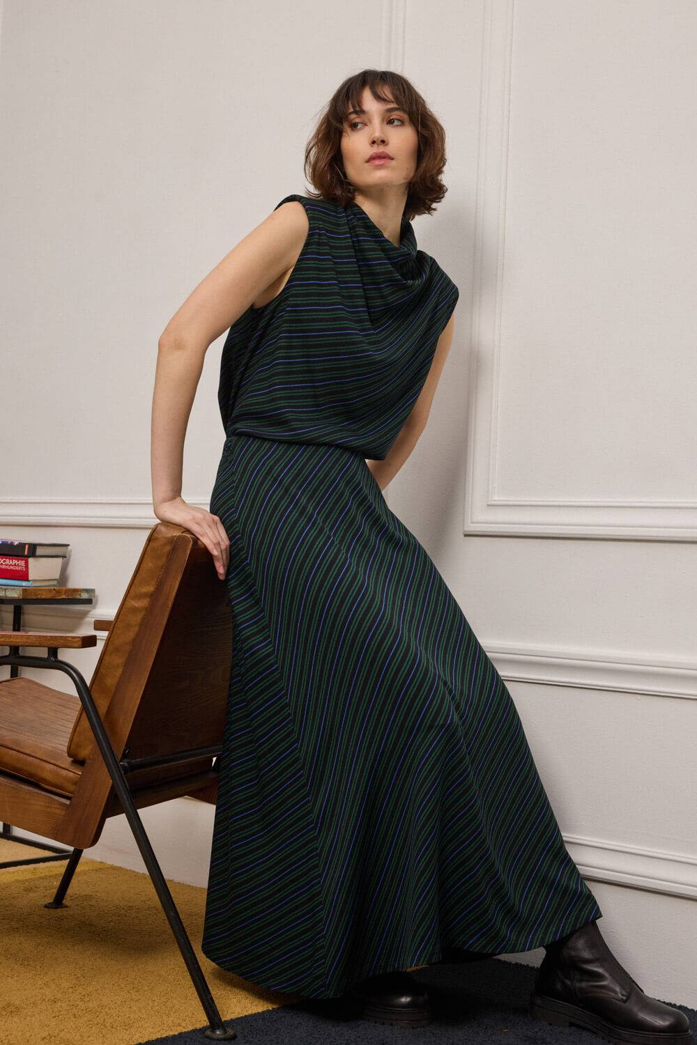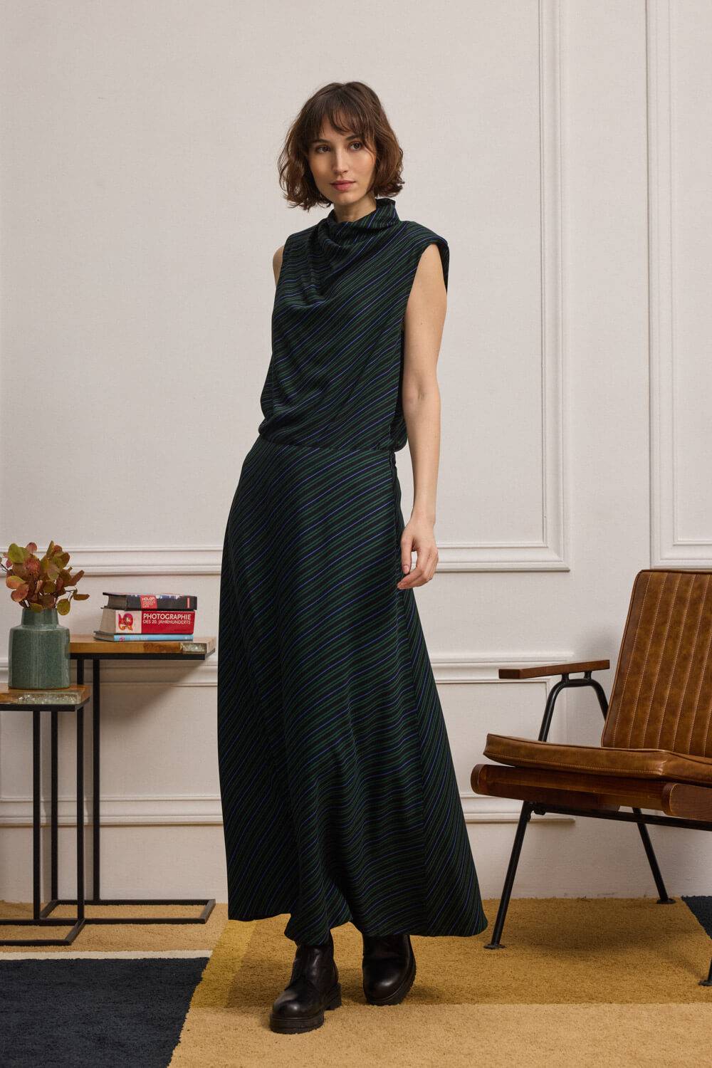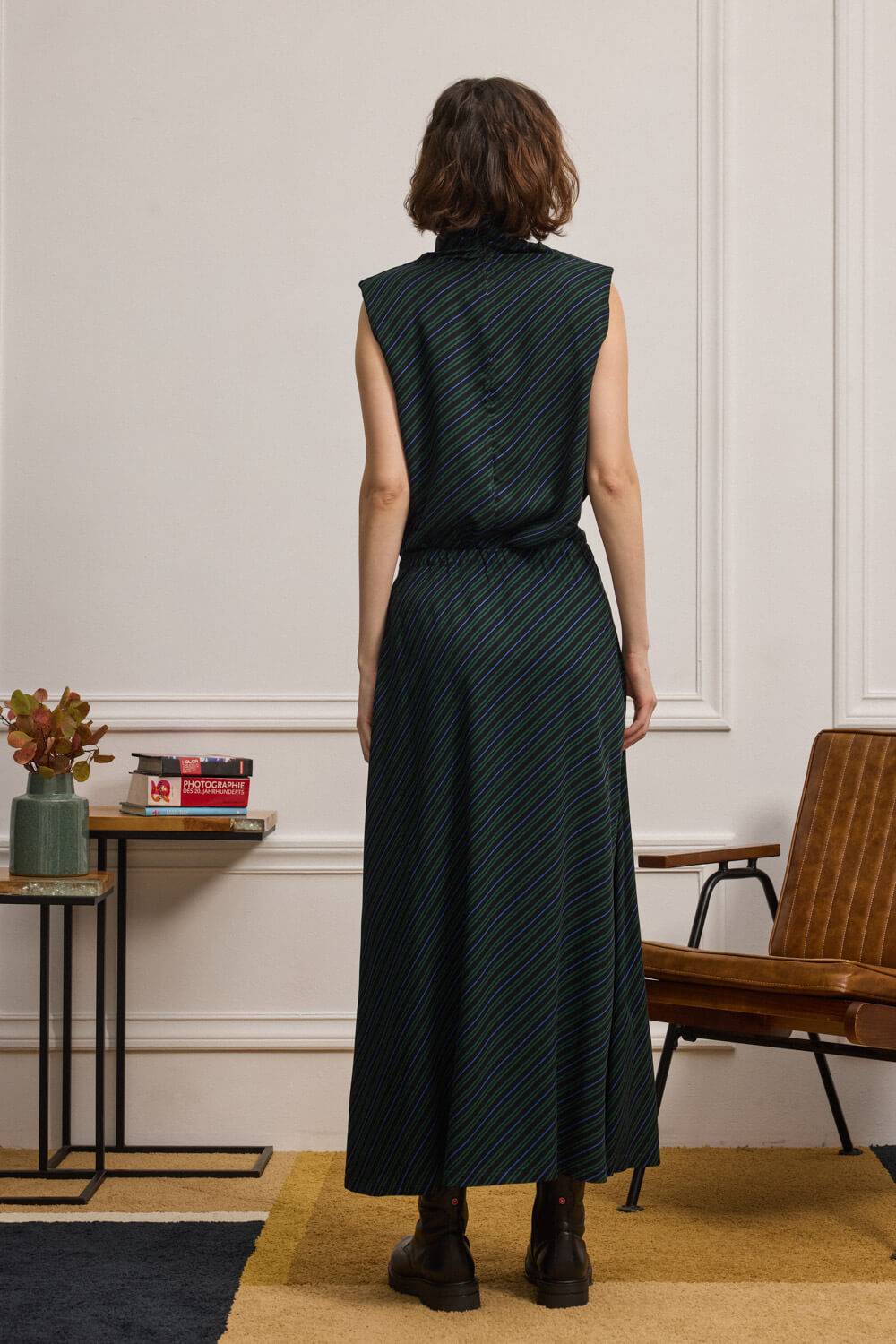 Midi φούστα με διαγώνιο ριγέ print, από 100% viscoze Ecovero με ανάλαφρη αίσθηση και φυσική κίνηση. Η γραμμή της ανοίγει σταδιακά προς τα κάτω, χαρίζοντας θηλυκή σιλουέτα, ενώ διαθέτει λάστιχο στο πίσω μέρος για άνετη εφαρμογή. Κλείνει στο πλάι με αόρατο φερμουάρ για καθαρό τελείωμα.