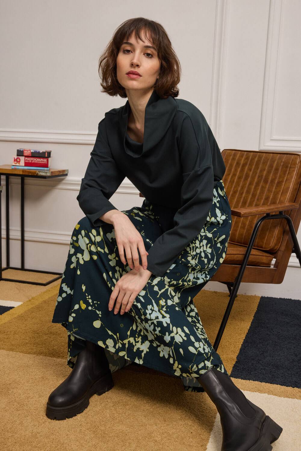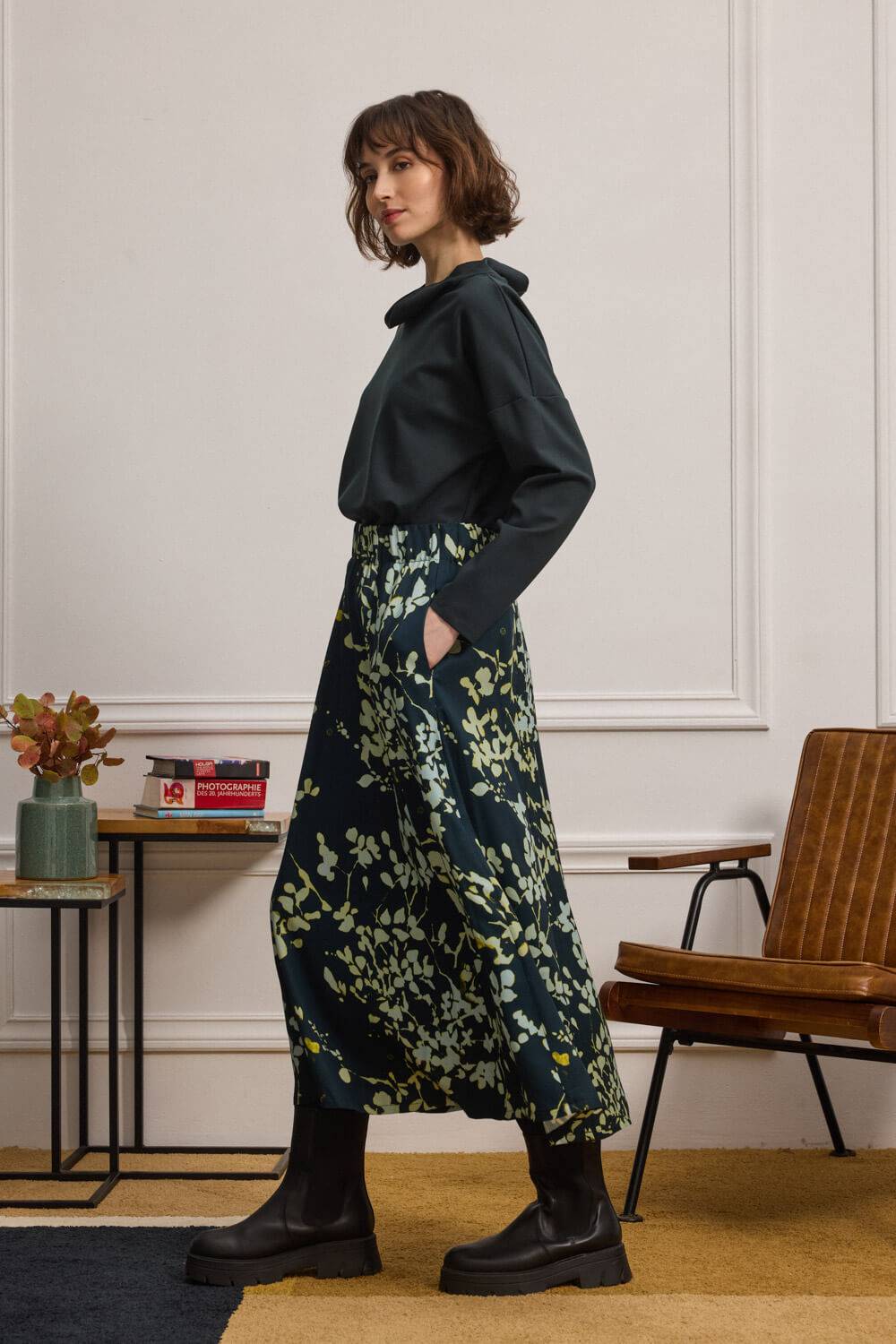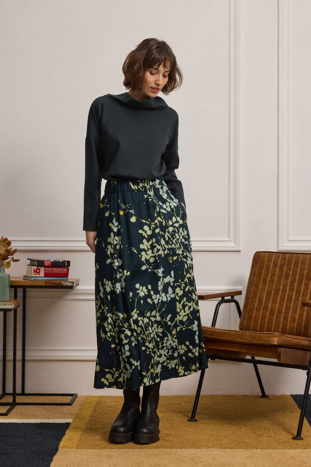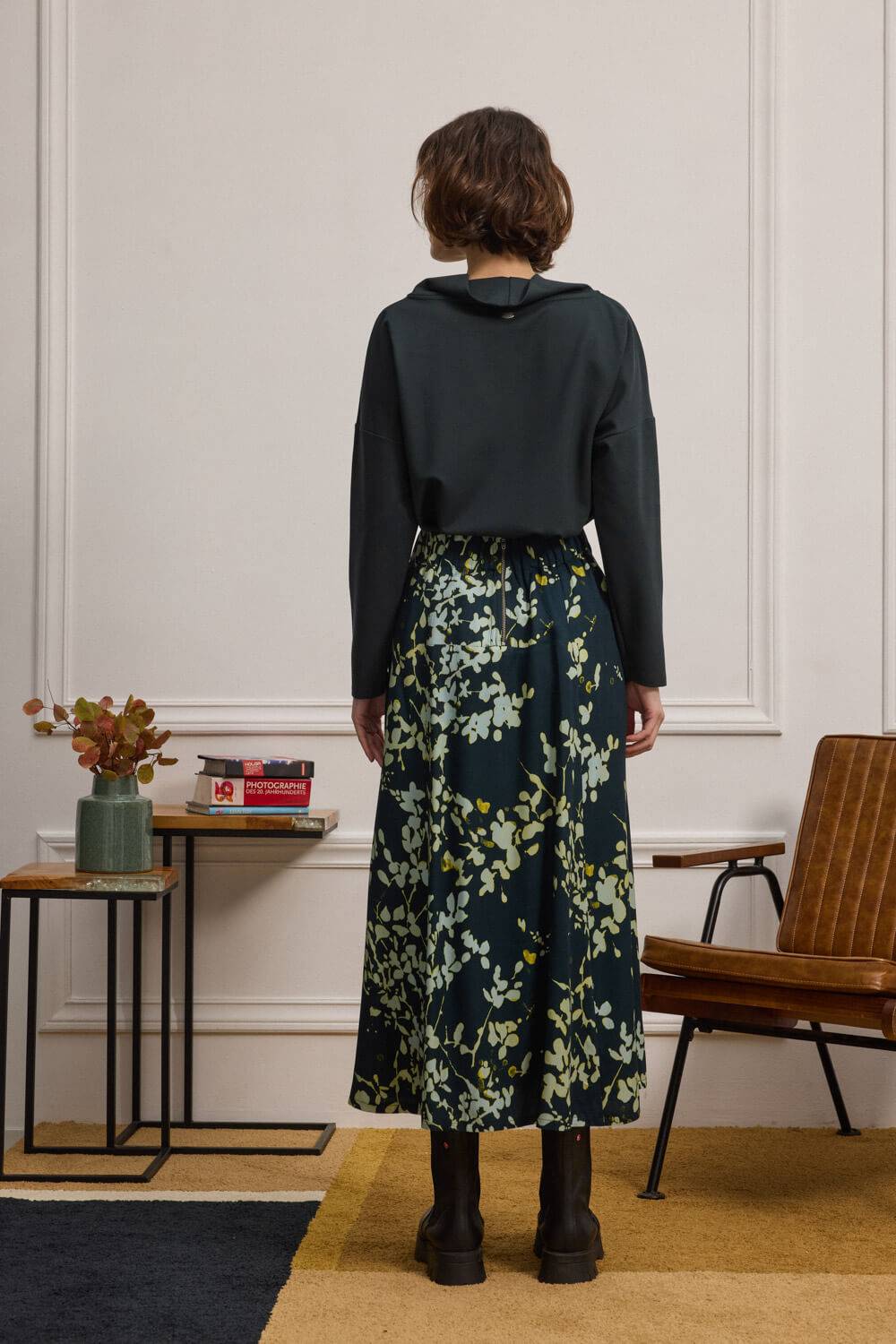 Midi φούστα σε εβαζέ γραμμή, με floral print σε αισθητική water color και ύφασμα από 100% viscoze Ecovero. Το λάστιχο στη μέση και το μεταλλικό φερμουάρ στο πίσω μέρος προσθέτει λεπτομέρεια και εξασφαλίζει άνετη εφαρμογή. Διαθέτει πλαϊνές τσέπες και αέρινη γραμμή που κολακεύει τη σιλουέτα.