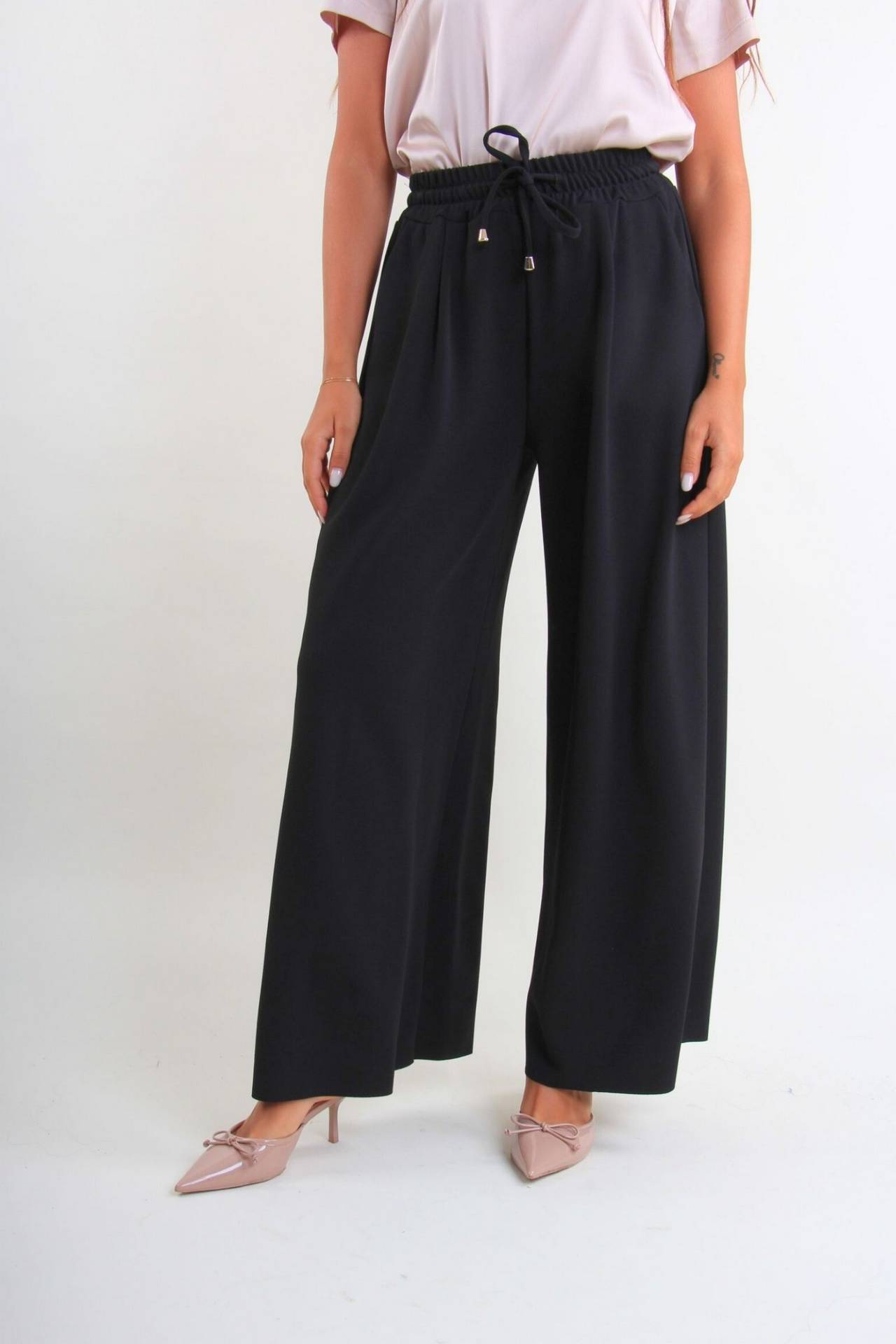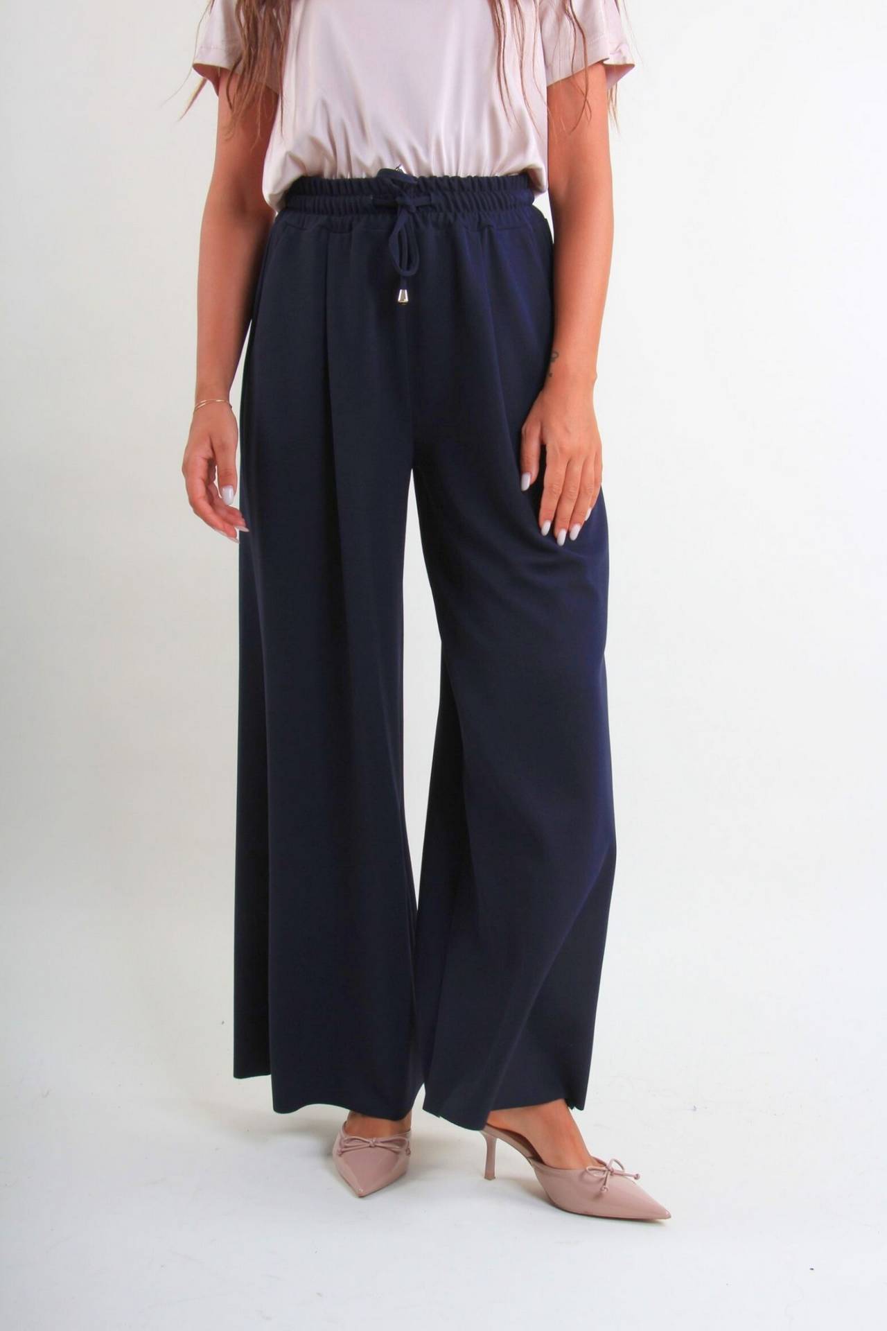 Παντελόνα από ελαστική ζορζέτα. Διαθέτει λάστιχο στη μέση και κορδόνι.