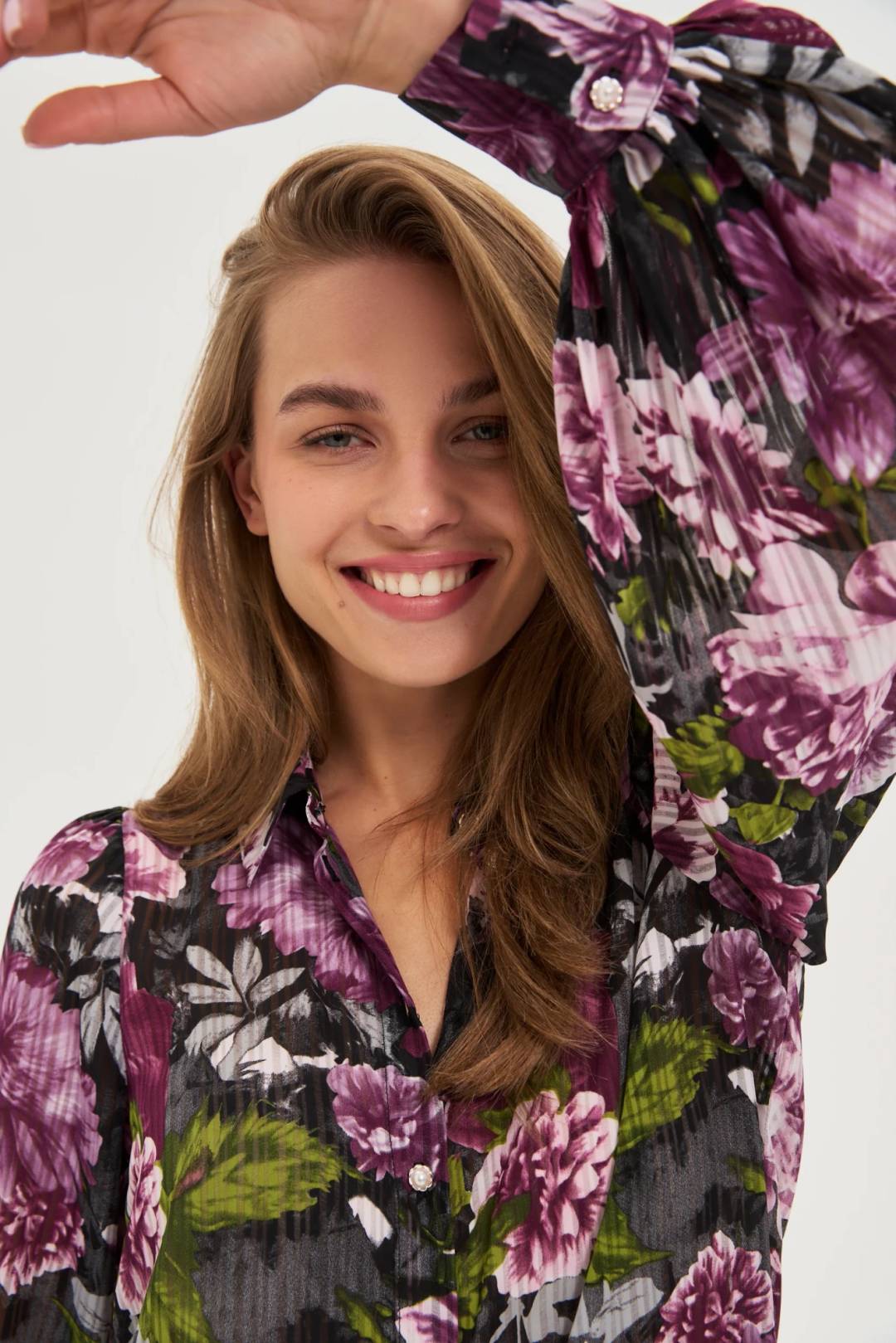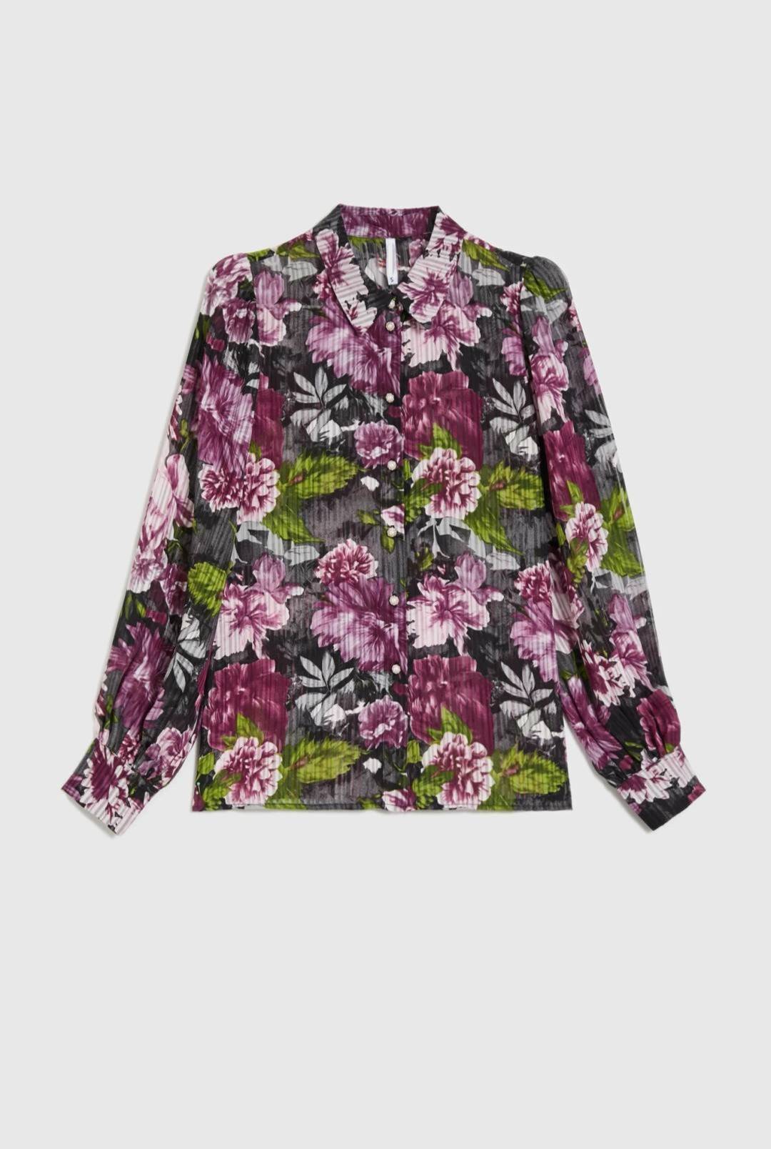 Πουκάμισο ημιδιάφανο σε μαύρο χρώμα με μωβ λουλούδια και κουμπιά πέρλες.
