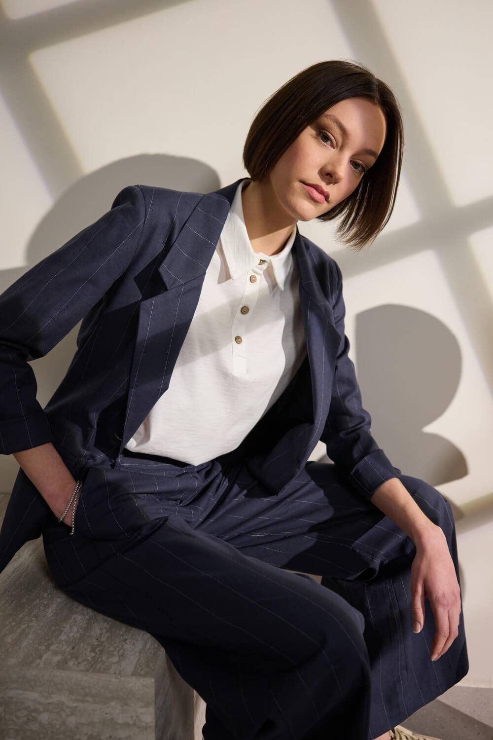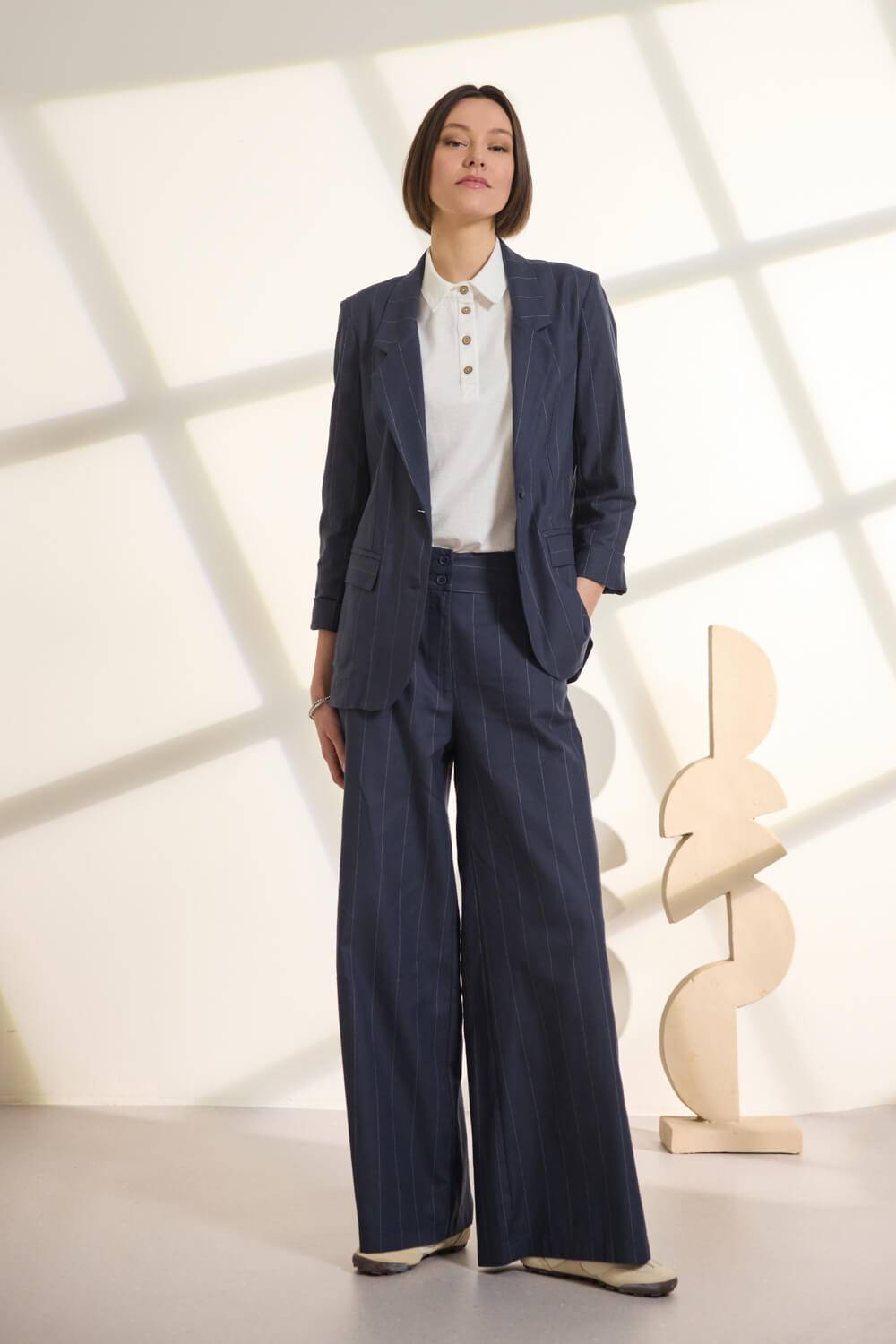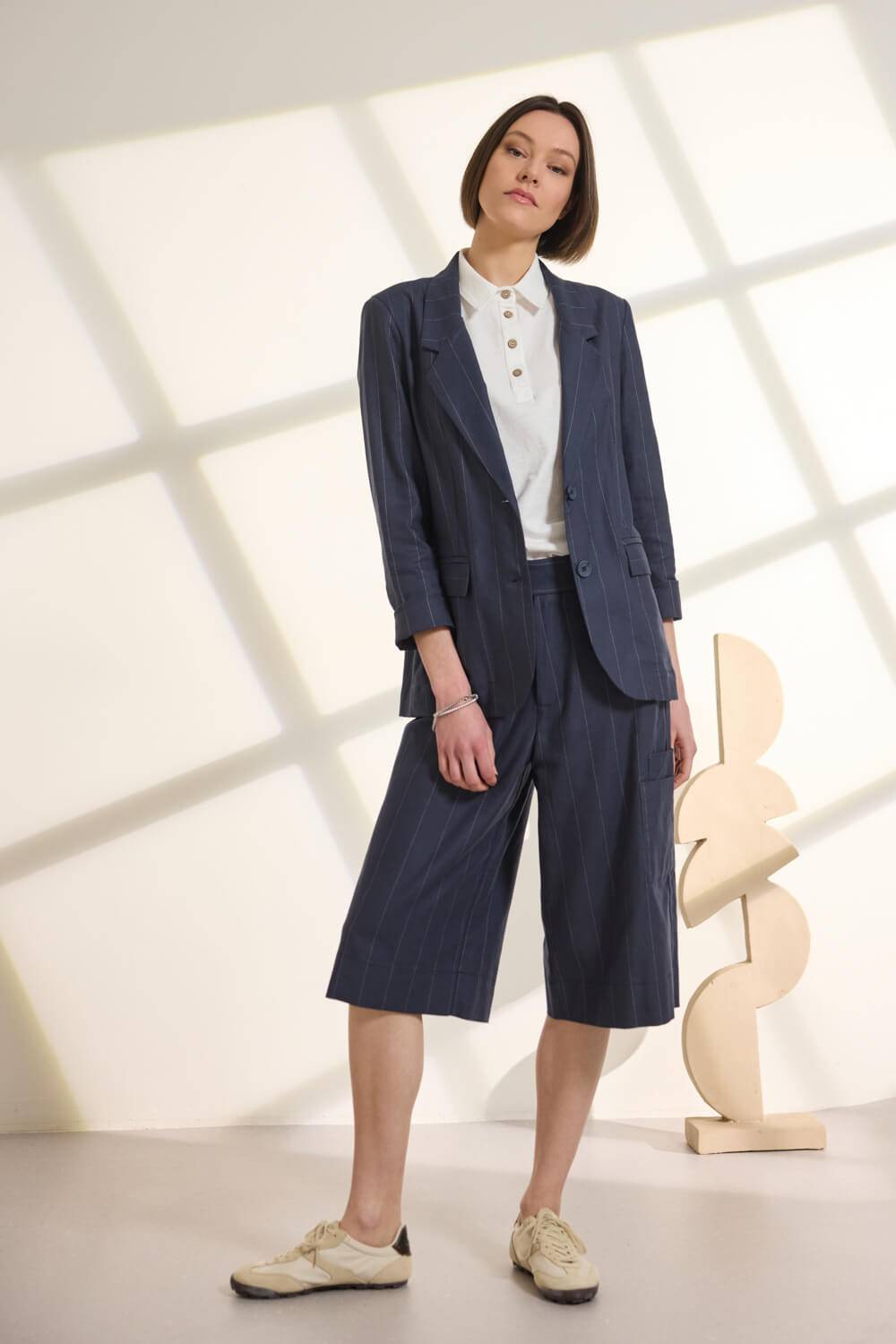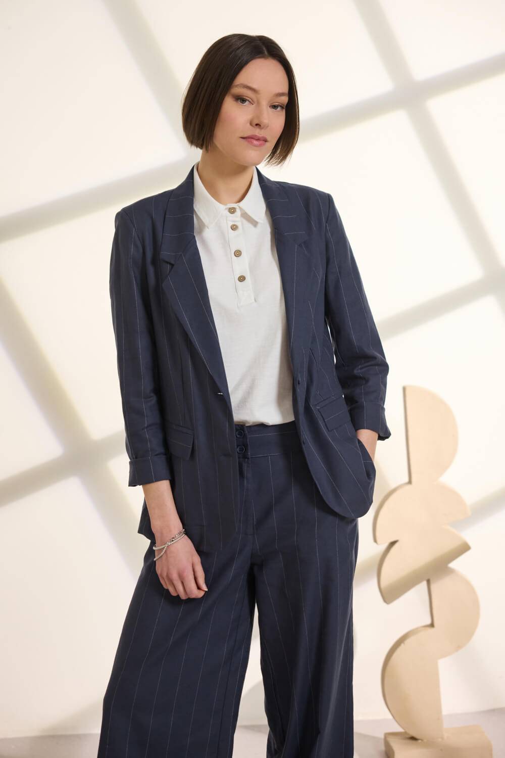Κλασικό σακάκι από ριγέ ύφασμα σε μείγμα cotton–linen με δομημένη γραμμή και διαχρονικό χαρακτήρα. Διαθέτει πέτο γιακά με βαθύ άνοιγμα και ώμους με βάτες που προσθέτουν ένταση και καλοσχηματισμένη σιλουέτα. Κλείνει μπροστά με δύο κουμπιά, ενώ οι τσέπες με καπάκι ενισχύουν τη λειτουργικότητα και τη συμμετρία του σχεδίου. Το μήκος που καλύπτει τη λεκάνη ισορροπεί ιδανικά τις αναλογίες, ενώ η ραφή στη μέση στο πίσω μέρος αναδεικνύει τη γεωμετρία της γραμμής. Συνδυάζεται άψογα με το παντελόνι Nerina ή τη βερμούδα Tindra από το ίδιο ύφασμα, για ένα ολοκληρωμένο, σύγχρονο και κομψό σύνολο.