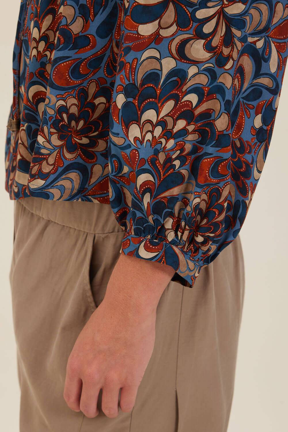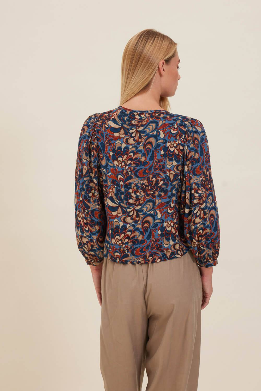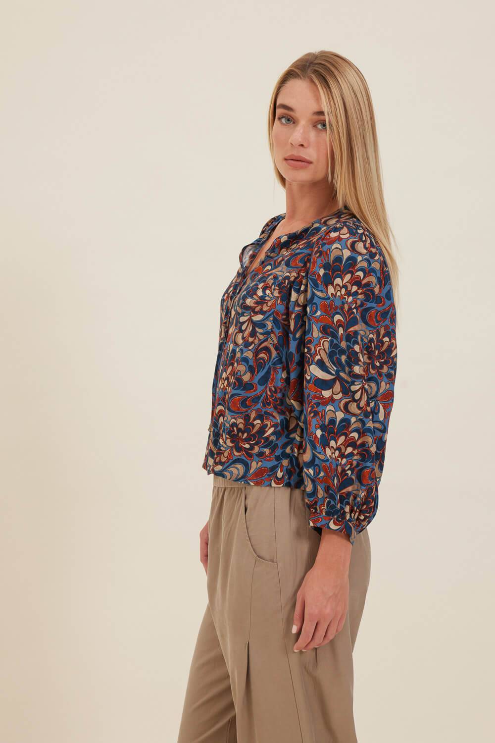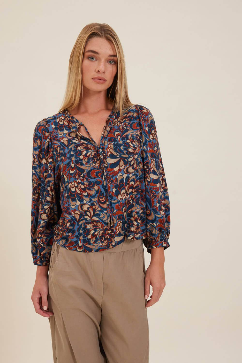 Τουνίκ σε χαλαρή γραμμή με τριγωνικό άνοιγμα στη λαιμόκοψη που δένει με δύο κορδόνια με μεταλλική bronze λεπτομέρεια στο τελείωμα και μανίκια με μικρή μανσέτα που σχηματίζει σούρες. Σε ύφασμα από εμπριμέ βισκόζη στις αποχρώσεις του μπλε και της τερακότας.