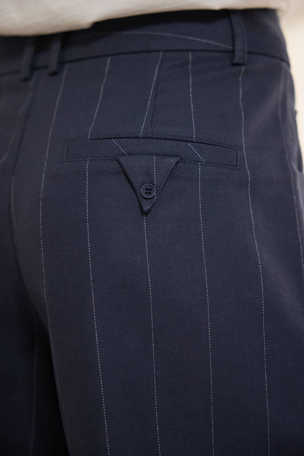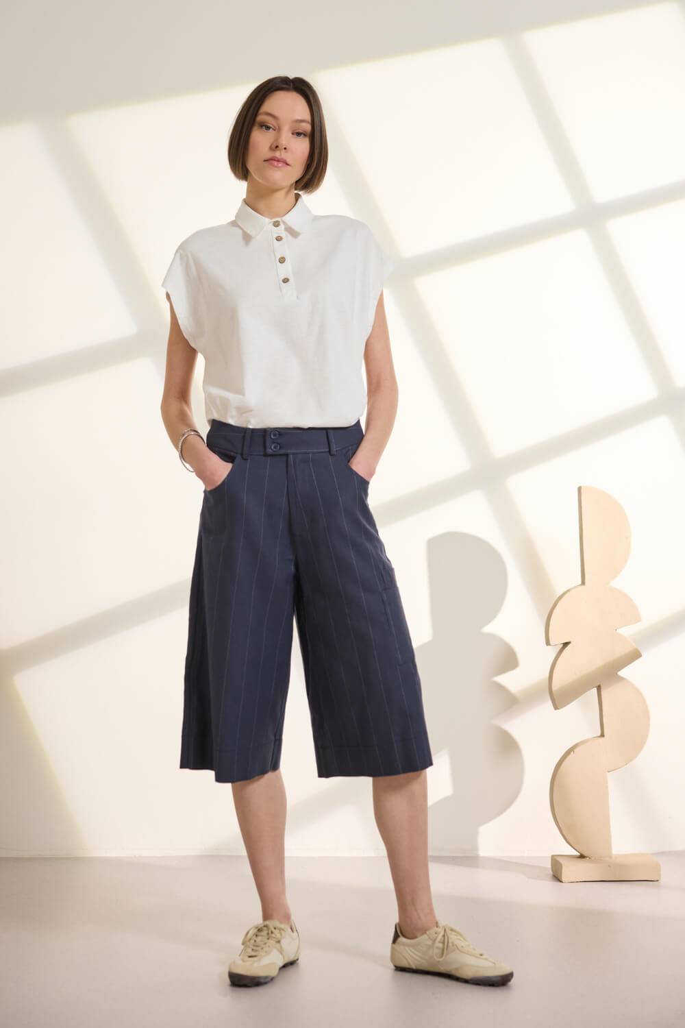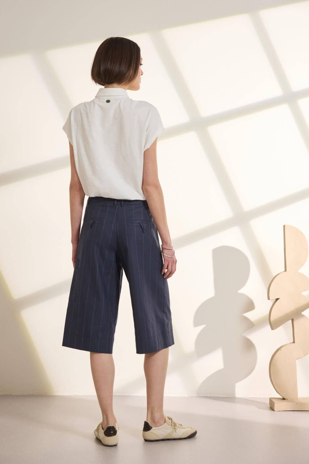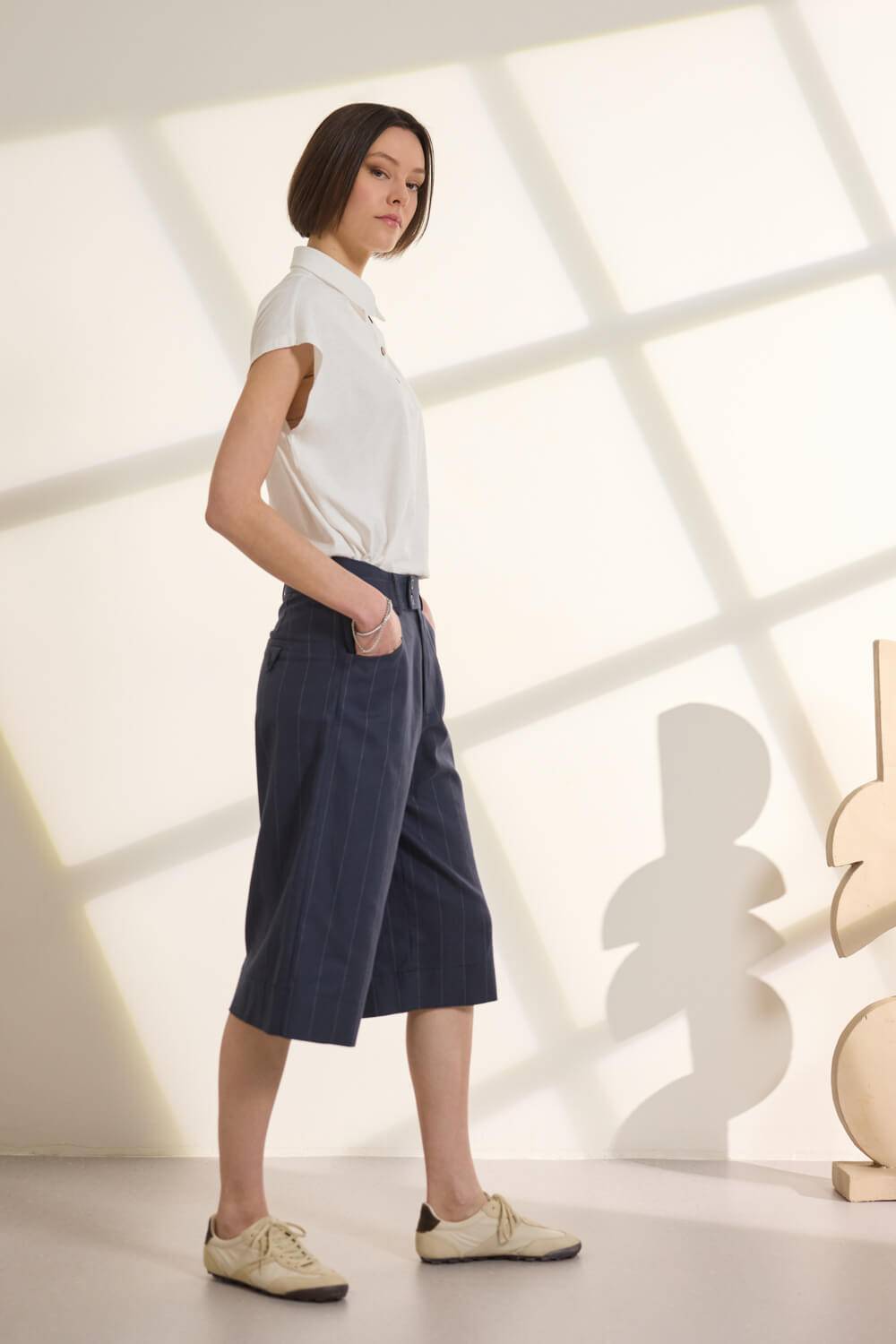 Ψηλόμεση βερμούδα σε γραμμή κάτω από το γόνατο, κατασκευασμένη από ριγέ ύφασμα σε μείγμα cotton και linen. Διαθέτει κλασικές κοφτές τσέπες μπροστά, ενώ πάνω από τη δεξιά τσέπη ξεχωρίζει ένα μικρό διαγώνιο τσεπάκι μια διακριτική και πρακτική λεπτομέρεια. Στη μία πλευρά προστίθεται διπλή σχεδιαστική τσέπη μια διακριτική εναλλαγή στο cargo στοιχείο, που προσδίδει χαρακτήρα. Στο πίσω μέρος, διακοσμητικά φιλέτα με κουμπί ενισχύουν τη σοφιστικέ αισθητική. Το παντελόνι κλείνει με φερμουάρ και δύο κουμπιά, ενώ τα θυλάκια για ζώνη προσφέρουν στυλιστική ευελιξία. Το φαρδύ στρίφωμα στο τελείωμα ολοκληρώνει το look. Συνδυάζεται ιδανικά με το σακάκι ONDINE για ένα σύνολο που ισορροπεί ανάμεσα στο casual tailoring και τη μοντέρνα άνεση.