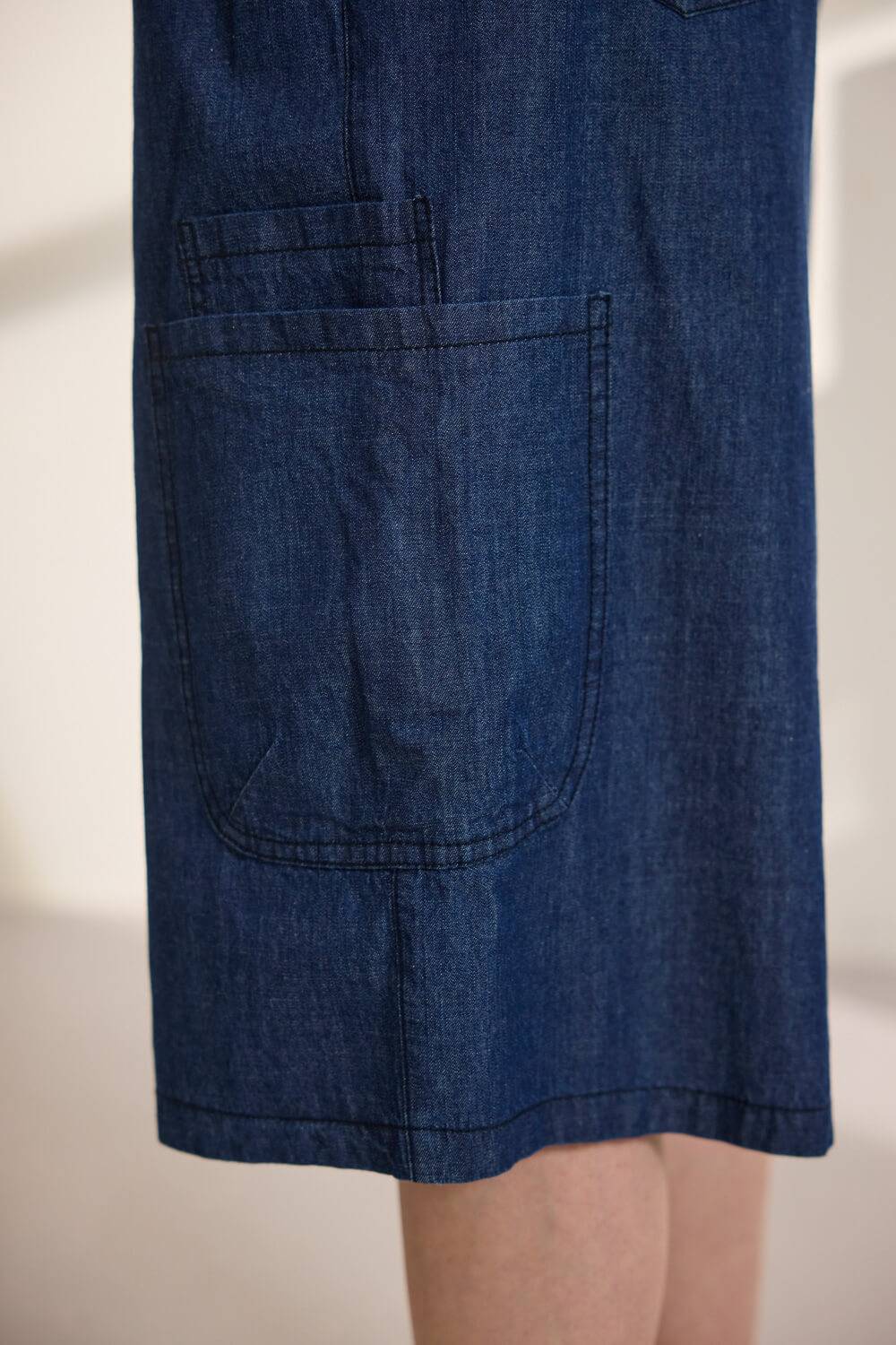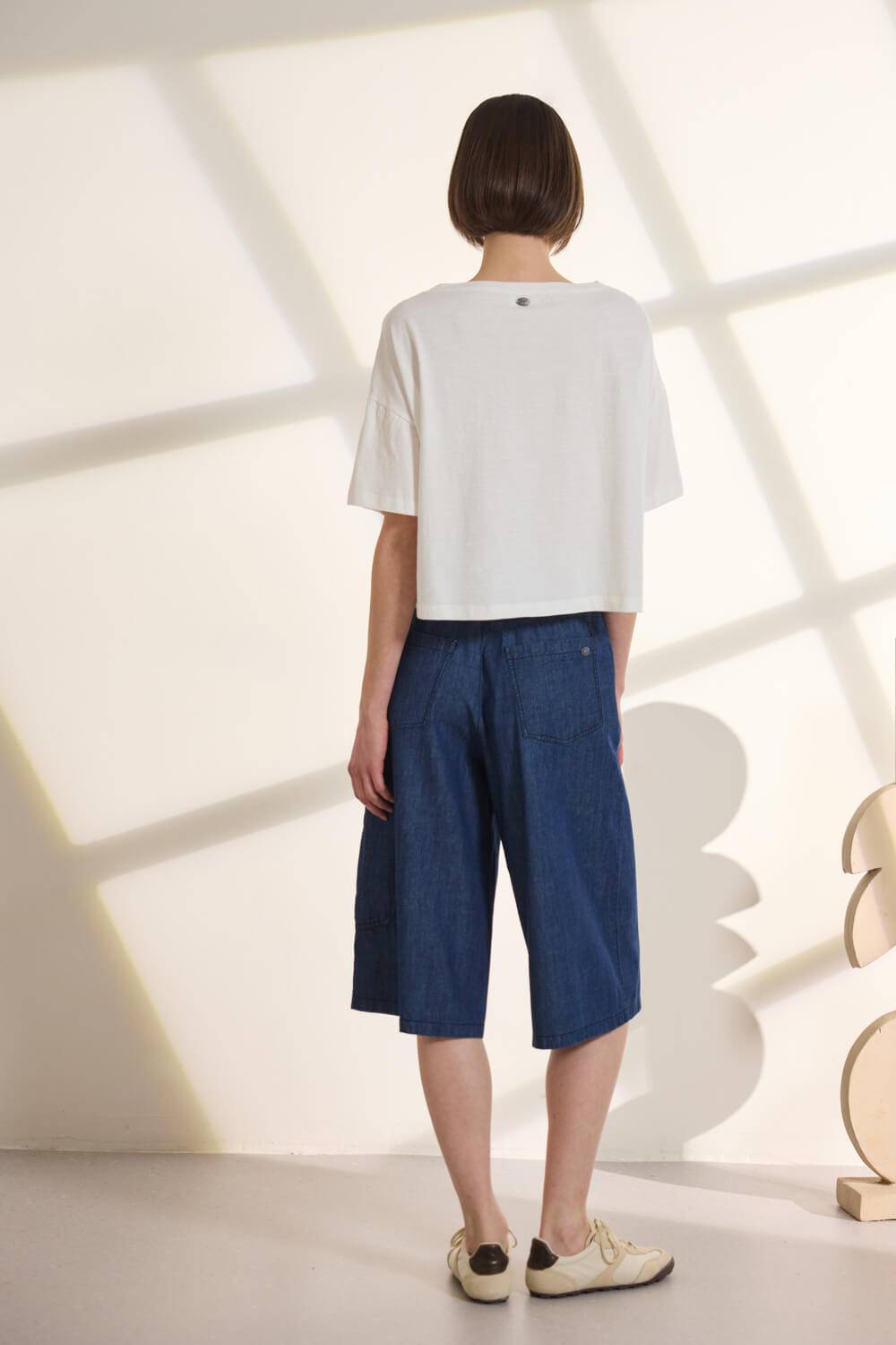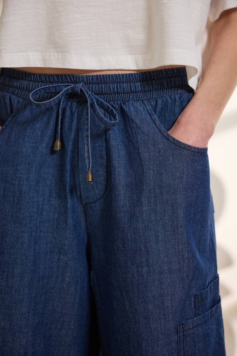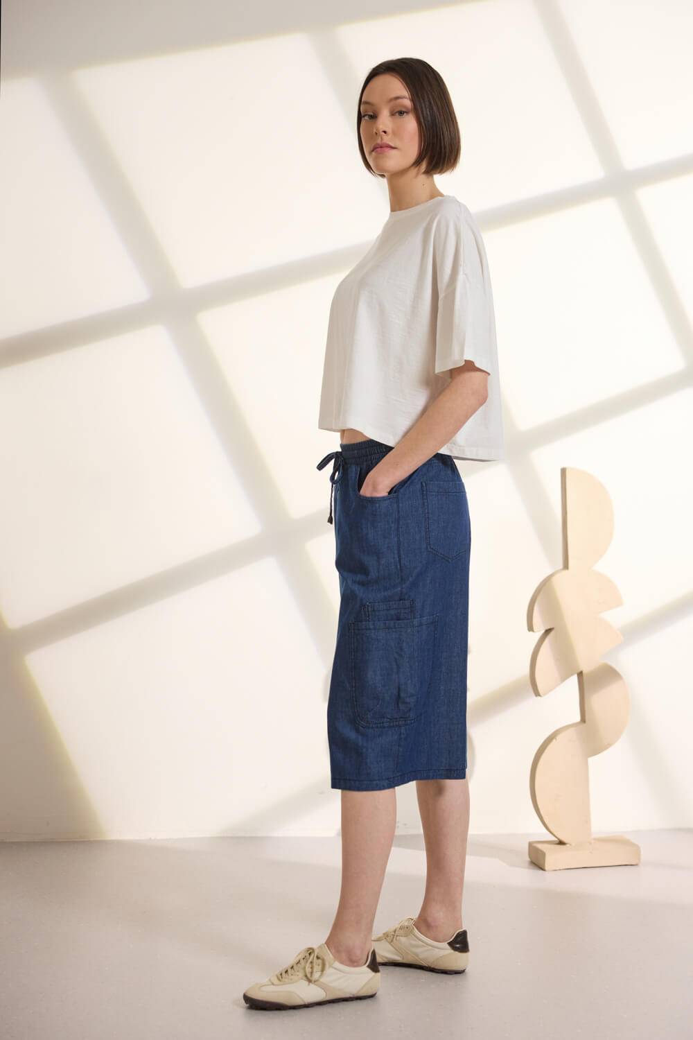 Τζιν βερμούδα 100% βαμβακερή με λάστιχο στη μέση που περνάει κορδόνι από το ίδιο ύφασμα για καλύτερη εφαρμογή, διακοσμημένο με μεταλλικές χάντρες. Διαθέτει πρακτικές τσέπες μπροστά και πίσω, ενώ στη μία πλευρά υπάρχει διπλή τσέπη στο πλάι που προσθέτει μοντέρνα, λειτουργική λεπτομέρεια. “Αυτό το προϊόν έχει φτιαχτεί με αγάπη και σεβασμό στο περιβάλλον χρησιμοποιώντας φυσικές ίνες.”